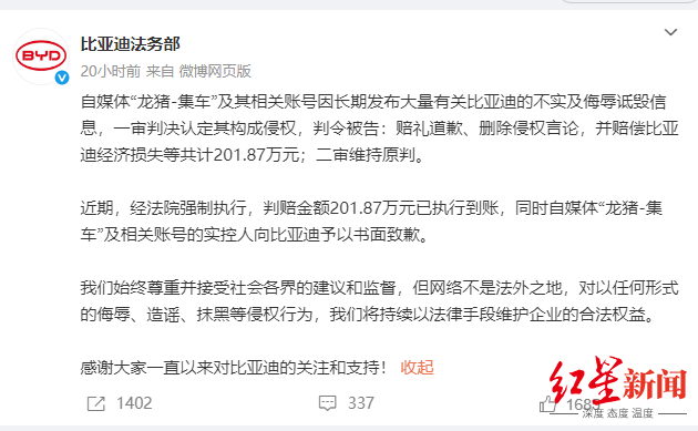 近期,经法院强制执行,判赔金额201.87万元已执行到账,同时自媒体“龙猪-集车”及相关账号的实控人向比亚迪予以书面致歉。