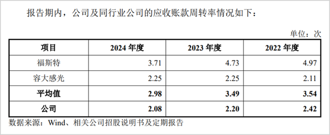 同时,初源新材应收账款周转率也在下滑,期间分别为2.42%、2.20%和2.08%,显著低于可比公司的均值水平。