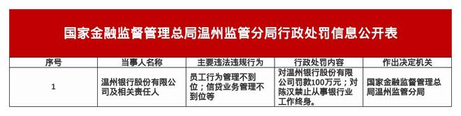 针对以上问题,国家金融监督管理总局温州监管分局对其罚款100万元;对该行相关责任人陈汉禁止从事银行业工作终身。