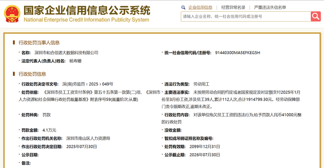 近日,深圳市和合信诺大数据科技有限公司(以下简称"和合信诺")因拖欠员工工资被处罚。