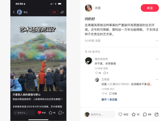 知名媒体人洪晃表示,在青藏高原做这种事真的严重破坏高原脆弱的生态环境。还号称可降解,塑料给一万年也能降解。不支持这种不负责任的艺术家。