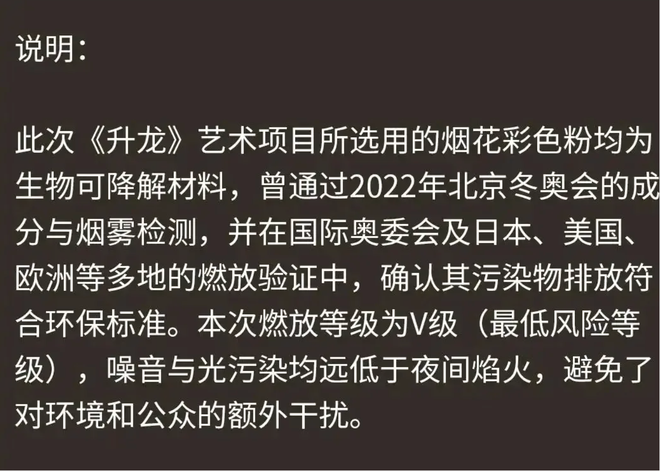 为体现环保的初衷,主办方称,此次《升龙》艺术项目所选用的烟花彩色粉均为生物可降解材料,确认其污染物排放符合环保标准。在生态保护层面也做了预案,例如提前引导鼠兔等小型动物离开燃放区,燃放后立即清理残留物等,确保不留生态隐患。