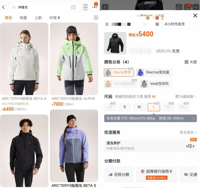 始祖鸟官方旗舰店中,多产品多型号缺货