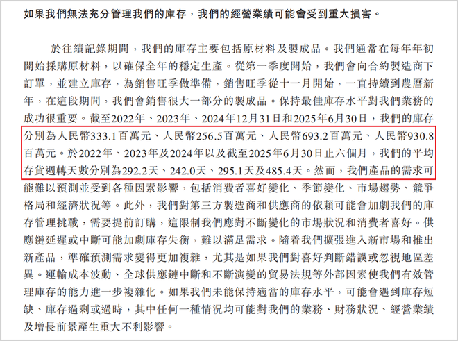 营销开支的持续攀升成为侵蚀公司利润的重要因素。报告期内销售及分销开支从1.99亿元大幅增加至2.61亿元,占收入比重从27.3%一路攀升至39.7%。公司为推进品牌年轻化转型,签约了多位明星代言人并频繁在时尚活动亮相。然而,这种高举高打的营销策略尚未带来相应的利润回报,反而使得存货问题日益突出。