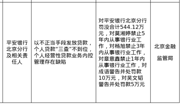 罚单显示,平安银行北京分行的主要违法违规行为是:以不正当手段发放贷款,个人贷款"三查"不到位,个人经营性贷款业务内控管理存在缺陷。