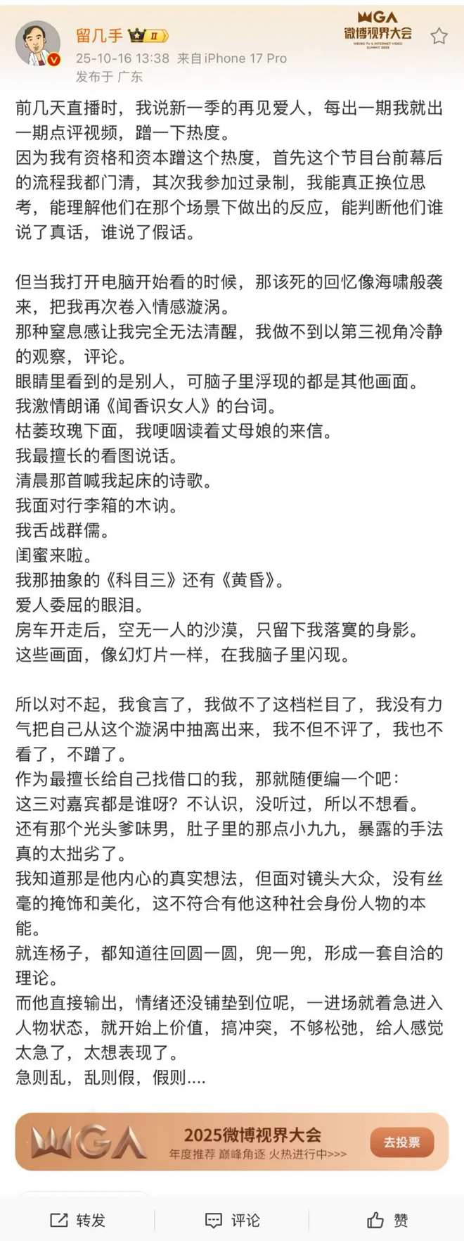 新一季《再见爱人》开播后,留几手发文表示不会更新《再见爱人5》的点评视频,坦言再回忆节目会有窒息感。此外他还调侃新一季嘉宾(路行)的表现"过于急切""不够松弛",认为其有刻意表达制造冲突之嫌。