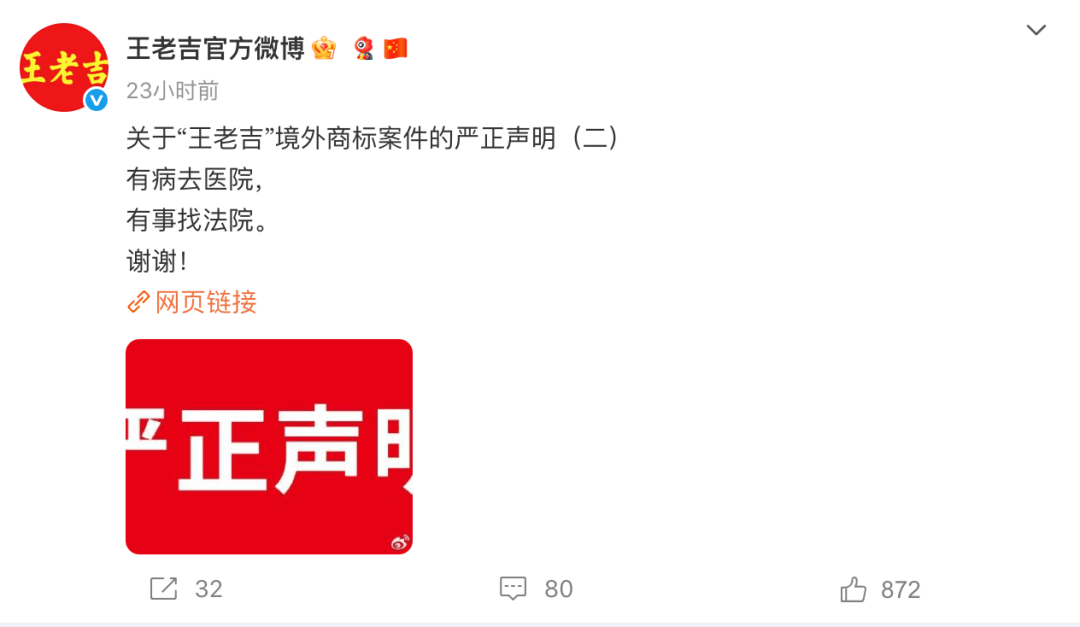 王老吉发文有病去医院有事找法院,10国判撤销,欧盟加拿大却胜诉 2025年10月10日晚9点,广州王老吉大健康产业有限公司的微信公众号"王老吉Walovi"突然更新一条推送,标题是《关于"王老吉"境外商标案件的严正声明(二)》,正文只有短短12个字:"有病去医院,有事找法院。谢谢!"没有点名道姓,没有长篇大论,却像一颗投入湖面的石子,瞬间在商界激起千层浪。网友们...