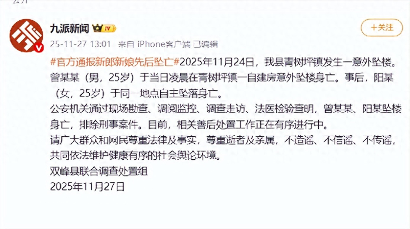 红双喜的贴纸还没来得及贴在门窗上,原本该响起的唢呐与鞭炮,却被两声沉重的坠落击碎在湖南双峰县青树坪镇的晨雾里。2025年11月24日,距离曾某某与阳某约定的婚礼仅剩一天,这对25岁的恋人却在女方家的自建房内先后坠楼,将所有的憧憬永远定格成了遗憾。11月27日,双峰县联合调查处置组的官方通报正式对外发布,排除刑事案件的结论,让这场悲剧更添一层令人扼腕的底色。