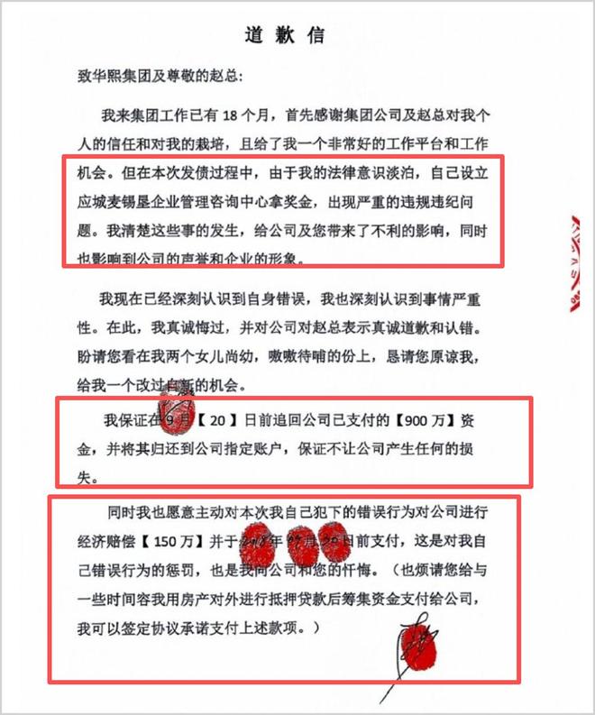 为减轻罪责,李振还曾向华熙集团和董事长赵燕写了一封《道歉信》,在这封《道歉信》中,李振承认:“在本次发债过程中,由于法律意识淡薄,自己设立应城麦锡垦企业管理咨询中心获取奖金,出现严重违规违纪问题。”