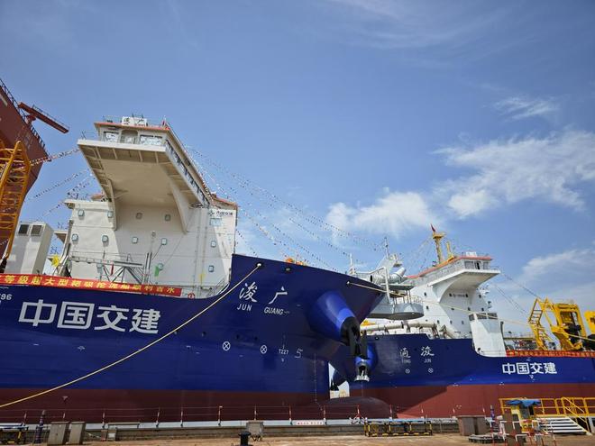 中国交建推出两艘亚洲最大的耙吸挖泥船,用于海底吸挖泥沙作业,这两艘船高达40层楼,具有卓越的性能和先进的技术,将极大地提高海洋工程的效率和质量,这一重大进展标志着中国在海洋工程领域的实力不断增强,对于促进海洋资源的开发和利用具有重要意义。