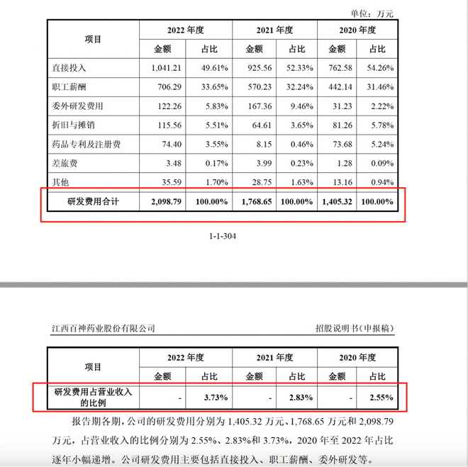 而作为一家研发创新药品的高新技术企业,百神药业的研发费用远低于销售费用。报告期各期,公司研发费用分别为0.14亿元、0.18亿元和0.21亿元,占营收比例2.55%、2.83%和3.73%,累计研发费用为0.53亿元。