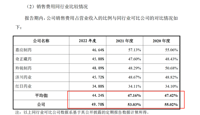 2020年至2022年,百神药业的销售费用分别为3.03亿元、3.32亿元、2.80亿元,三年花了超9亿元在销售费用上,占营业收入的比例分别为55.02%、53.03%和49.7%,高于平均值。
