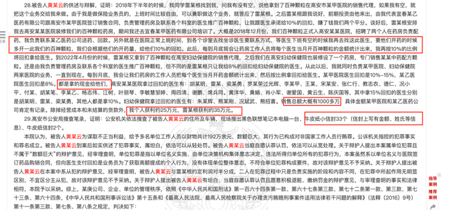值得注意的是,所有回扣均为现金支付,并且用信封装好交付给医生。两家医院涉及的医生超过30个,药品销售总额超1000万,黄某云个人获利约25万元,雷某根获利约35万元。