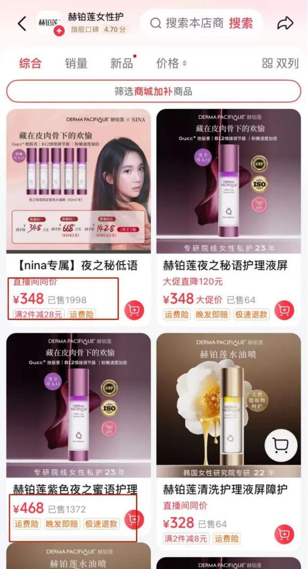 "赫铂莲"抖音商品橱窗显示,"赫铂莲夜之蜜语护理液屏障k老k衰去色素保养精华水油喷雾"的售卖价格为348元-468元,"夜之秘语高阶小紫管"虽然为橱窗目前并未售卖,但类似产品的价格也在348元-388元。