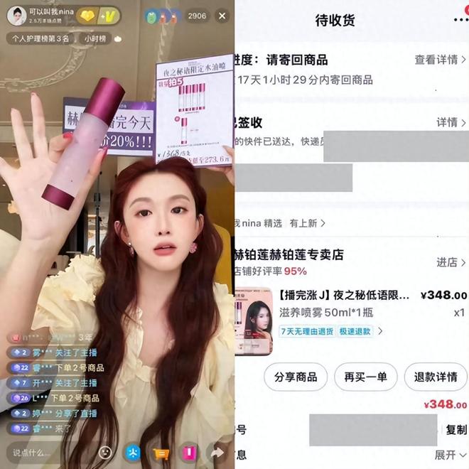 不过这场直播引起了笔者的注意:查询资料时发现,这场直播的主讲人是一位粉丝刚过百万的抖音美妆博主"可以叫我nina",但是带货"赫铂莲"品牌产品仅仅两场直播的带货佣金分成就高达数百万元,没有热搜、没有联名、没有明星助阵,也不是品牌造势的专场,只是对着镜头讲了几个小时,仅靠人设和算法推流,就拿走了利润链条中最大的一份。
