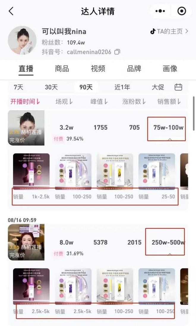 据笔者调查,尽管粉丝数刚刚突破百万,在抖音美妆领域的体量尚称不上顶流,但博主"可以叫我nina"在美奢领域可是绝对的头部(富婆收割机),近期的两场直播,却在行业内部激起了不小的波澜。据灰豚数据监测显示,在8月16-17日这两场直播中,该博主带货"赫铂莲"这一品牌的产品销售额分别达到了250万元-500万元和75万元-100万元。并且更加值得注意的是,这个品牌"赫铂莲"店铺注册和运营公司注册也刚刚一个月,新店铺新公司有如此大的交易额和影响力,主要功劳主要靠这个博主"可以叫我nina"。