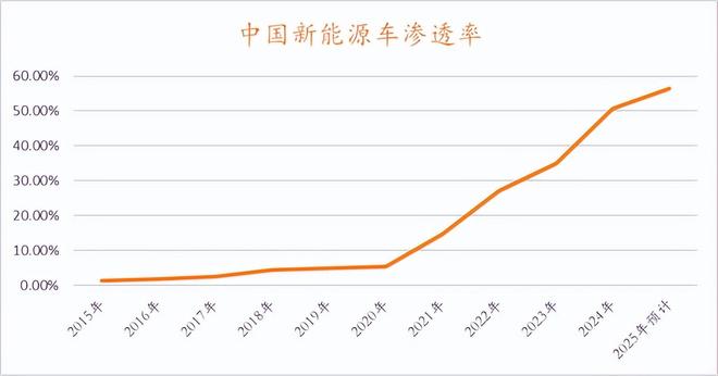 再比如新能源车,2021年之前行业缓慢爬行,2021年-2024年这三年国内新能源车渗透率从10%左右直线提高到50%以上。