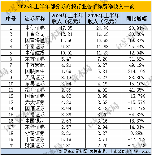 据Wind统计,上半年42家上市券商的经纪业务手续费净收入规模均实现增长。中信证券以64.02亿元排名第一,国泰海通以57.33亿元排名第二;广发证券、华泰证券、招商证券、银河证券、国信证券、中信建投均在30亿元至40亿元区间内。