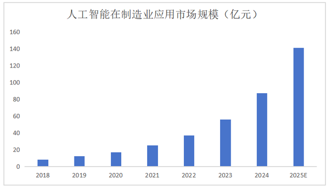据锐观咨询预测,2025年人工智能在制造业应用的市场规模达140亿元,2018-2025年复合增速高达50%以上。