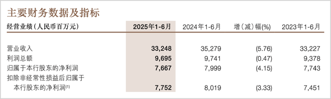 中报显示,浙商银行实现营收332.48亿元,同比下降5.76%;归母净利润76.67亿元,同比减少4.15%。