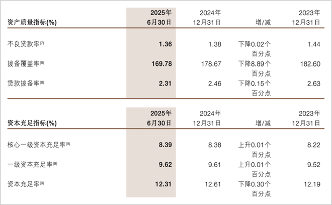 一级资本充足率和核心一级资本充足率均呈上升态势,安全垫更加厚实。拨备覆盖率169.78%,保持合理水平。