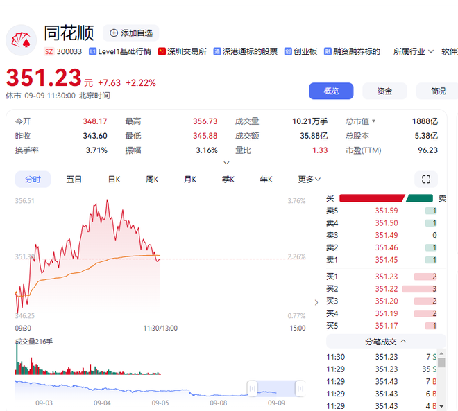 二级市场上,自去年“9•24”行情以来,同花顺股价累计涨幅超250%,并于今年8月18日触及历史最高点426.88元/股。