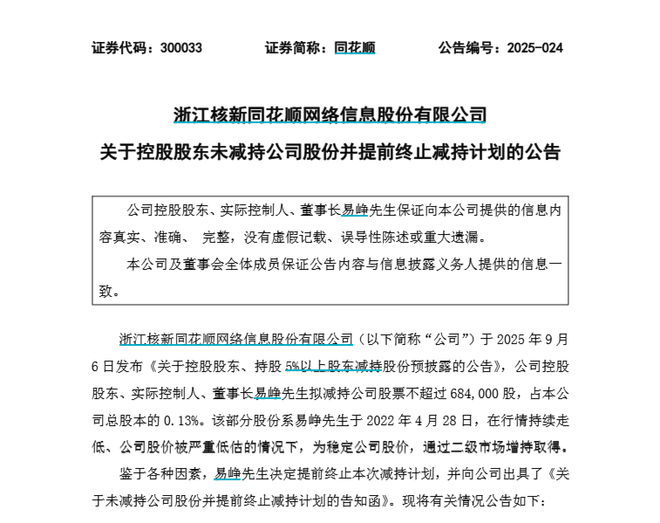 凌晨公告同花顺董事长提前终止减持计划此前言论引争议