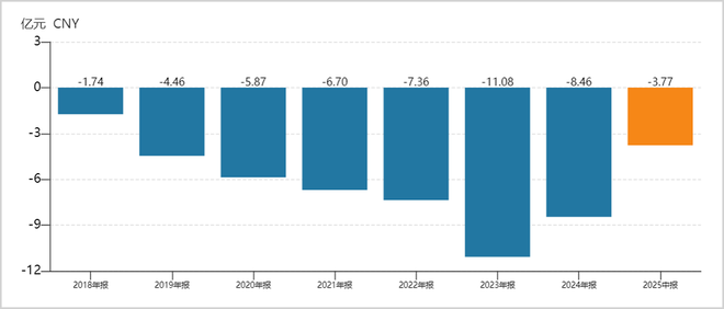 尽管收入有所起色,但迪哲医药离扭亏为盈还相去甚远。自2018年披露财务数据以来,公司累计亏损已高达49.4亿元。其中,2024年亏损约8.5亿元,为历年首次收窄,但2025年亏损又有扩大迹象。