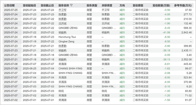 其中,4-5月,张小林累计减持超360万股,套现超2亿元。7月以来,副总经理杨振帆三次累计减持115万股,套现超7800万元。此外,副总经理乔卫军、陈素勤、吴清漪,董秘吕洪斌以及核心技术人员陈侃等也纷纷跟进减持。
