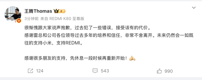王腾表示,感谢雷总和公司各位领导过去多年的培养和信任,非常不舍离开。未来仍然会一如既往的支持小米,支持REDMI。“感谢很多朋友的支持,先休息一段时候再重新开始!”