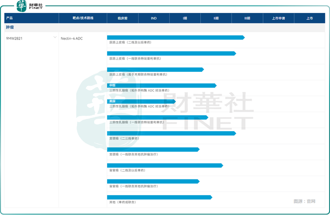 根据招股书,迈威生物的核心产品9MW2821是利用公司专有的ADC平台及一体化高效抗体发现平台而开发的新型靶向Nectin-4 ADC。根据弗若斯特沙利文的资料,截至2025年8月22日,就临床开发阶段而言,9MW2821是在中国开发的用于治疗尿路上皮癌的所有靶向Nectin-4 ADC中进展最快的,在全球仅次于Padcev(唯一经FDA批准的靶向Nectin-4 ADC),也是全球首款进入宫颈癌关键III期试验阶段的靶向Nectin-4 ADC。