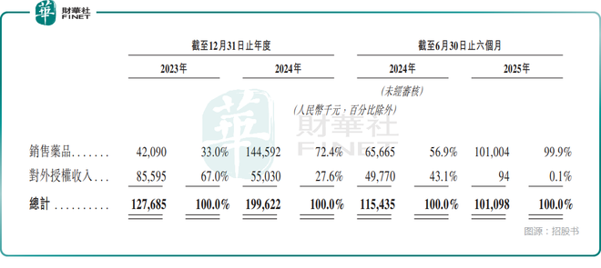 数据显示,2023年、2024年及2025年上半年,其营收分别为1.28亿元(人民币,下同)、2.00亿元和1.01亿元,来自药品销售、对外授权收入。不过,对外授权收入在持续下降。
