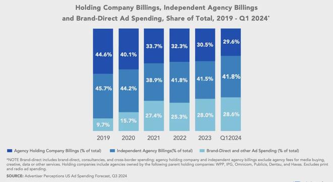 根据行业研究机构AdvertiserPerceptions的数据,品牌直接掌控的广告预算比例正在持续上升:从2019年的9.7%增长至2024年一季度的28.6%。与此同时,流向大型广告集团和独立代理机构的预算份额则在逐年下滑。