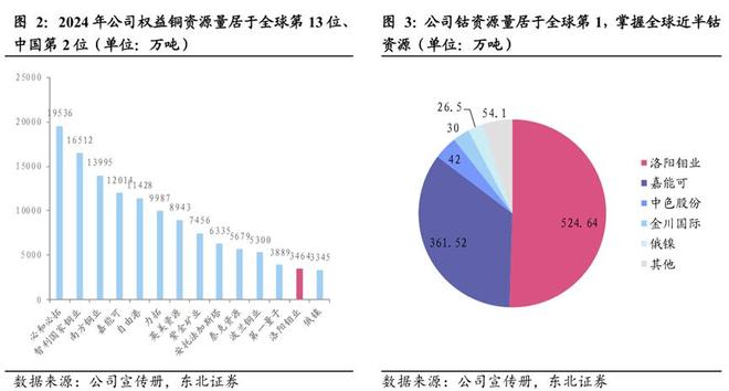 至2024年末,公司权益铜资源量居于全球第13位,中国第2位;钴资源量全球第1,掌握全球近半钴资源。