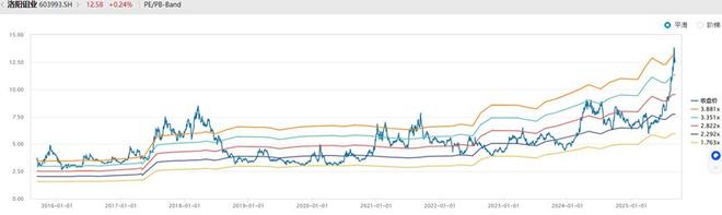 当前紫金矿业PB 4.77倍,洛阳钼业略低于紫金矿业,但鉴于紫金矿业中近一半营收来自金矿,金价目前处于上行通道中,矿产价值重估带来的PB高企,亦有其合理性。
