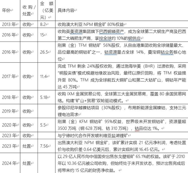 此后数年间,洛阳钼业便在国际上开启了几次关键性的大并购,从钼进一步延伸至铜、钴、铌、磷等,并打造"矿业+贸易"的双轮驱动战略。