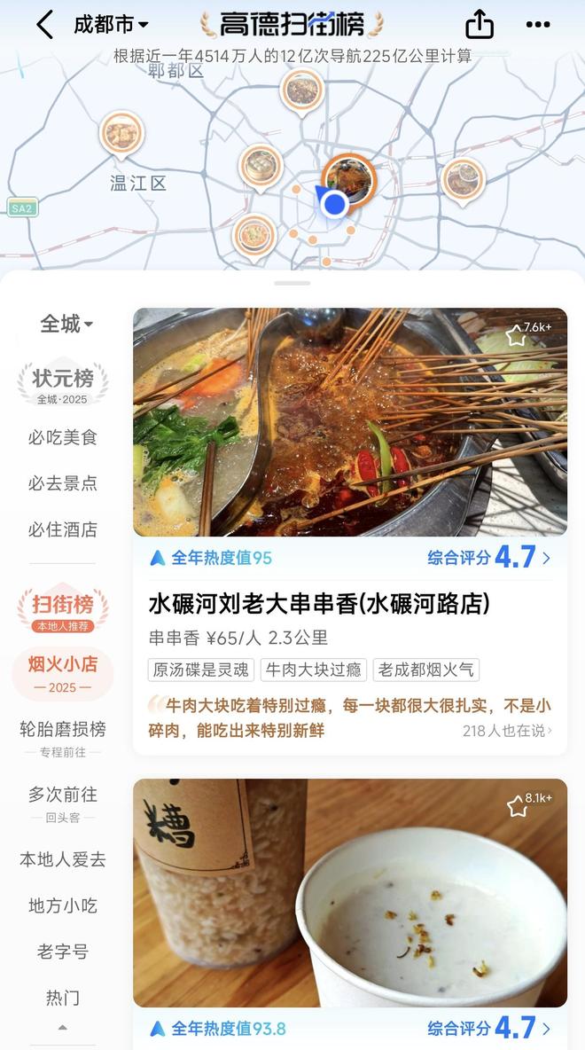 张新原称,“高德扫街榜”侧重于用户实时行为,由导航、搜索、消费等行为生成榜单;而大众点评则更依赖用户主动评价和内容积累。高德的优势在于其地图和出行场景的自然衔接,能够捕捉更多即时需求,而大众点评的优势在于长期积累的点评内容和用户社区。