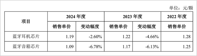比如在产品单价上,近年来杰理科技包括蓝牙耳机、智能音箱、智能穿戴等产品均出现了不同程度的下滑。以蓝牙耳机和蓝牙音箱芯片为例,2022年销售单价尚在1.28元/颗、1.25元/颗,到2024年便降至1.19元/颗和1.09元/颗。