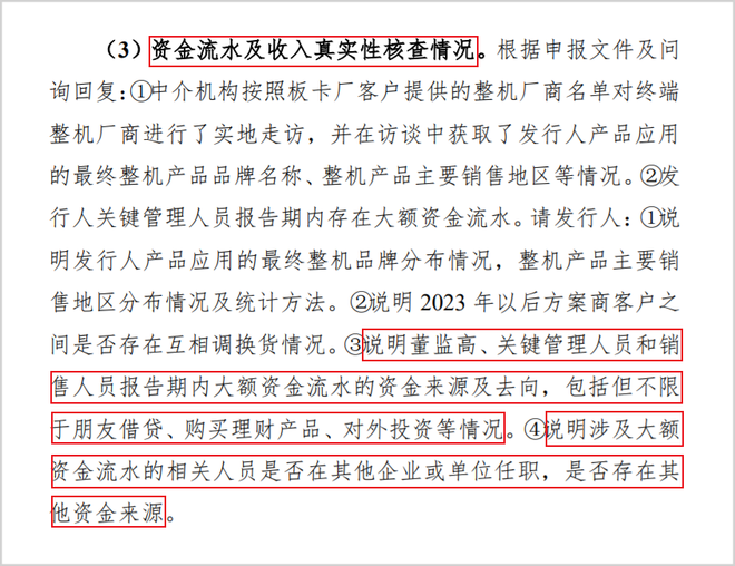 就比如在第三轮问询中,交易所仍然提出了资金流水及收入真实性核查等相关内控疑问,要求发行人说明董监高、关键管理和销售人员大额资金流水的资金来源及去向。