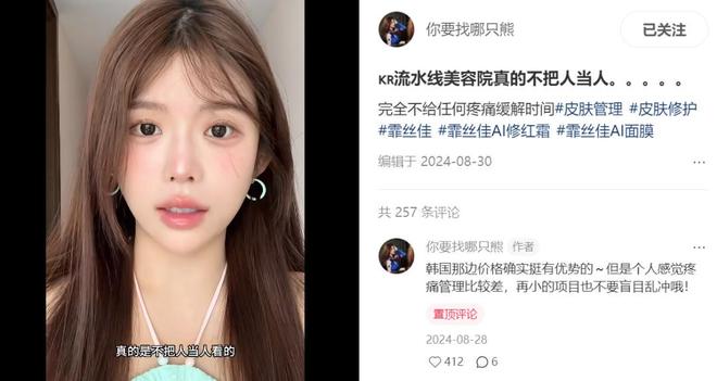 "韩国有些流水线整容医院,真的不把人当人看。"博主@你要找哪只熊 在vlog里如此说道。在韩国,不管做的项目再痛,医院全程都不会给顾客任何的缓解时间。和她同行的朋友,更是形容自己"就像案板上的猪,被人翻来翻去"。