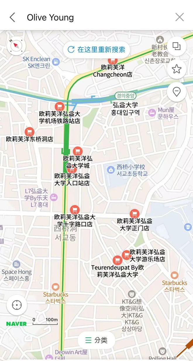 naver地图中显示的弘大商圈Olive Young门店
