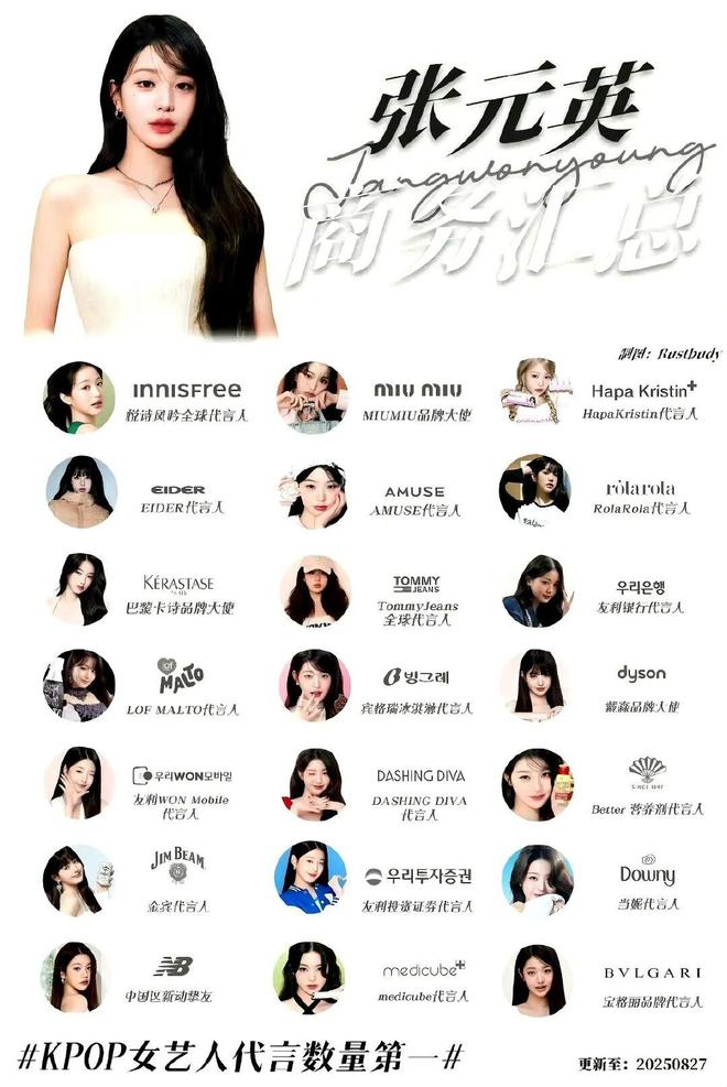 二是,近十年通过"文化立国",KPOP明星和文化的影响力随着影视、选秀、舞台大面积辐射,在韩国民众乃至全球消费者心中率先占位,潜移默化地重构了消费认知,带动了消费热情,以至于偶像在韩国演艺界的地位逐年上升,不再是鄙视链绝对的最底端。2024年,韩国女团IVE成员张元瑛就手握10个品牌的代言合约,涉及美妆、科技、服饰、食饮、支付等一众品类。