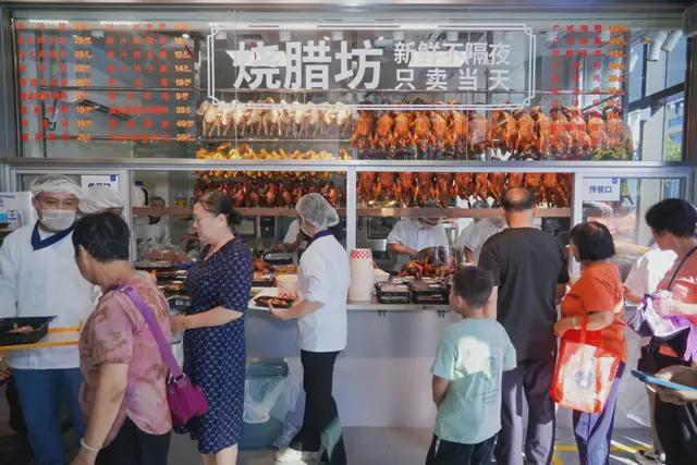 入口的现制烧腊坊,广东人餐桌上的心头好——烧鹅、叉烧、隆江猪脚等或按只悬挂,或成盘码放,档口玻璃上还印着醒目字样——「新鲜不隔夜」。社区生活的烟火气一下子升腾起来。