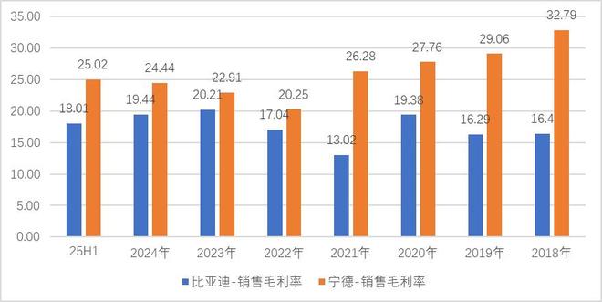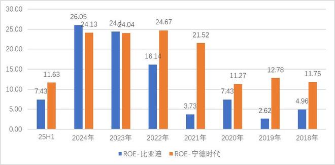 从过往年份来看,宁德时代销售毛利率多在25%以上,ROE常年在24%左右。比亚迪销售毛利率在17%左右,ROE波动较大。