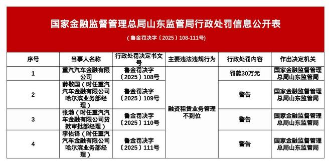 9月18日讯,近日,国家金融监督管理总局山东监管分局发布了罚单,剑指重汽汽车金融有限公司及其相关责任人。