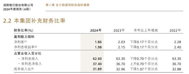 2024年3月,国家金融监督管理总局局长李云泽对外表示,近年来我国实体经济综合融资成本持续下降,银行净息差已降至20年来最低水平。2024年,招商银行的净息差仅为1.98%,首次跌破2%。在此背景下,当年招商银行净利润仅同比增长1.22%。