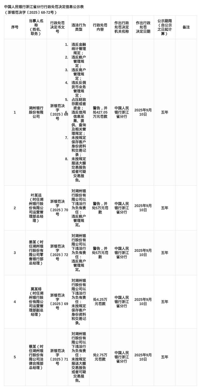 9月19日讯,近日,中国人民银行浙江省分行公示了行政处罚决定,剑指湖州银行股份有限公司及其相关责任人。