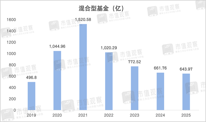 以混基型基金为例,作为权益类基金的代表,在2021年的规模高峰时曾达1520.58亿,但到2025年上半年便降至643.97亿,相比高峰期降幅已经过半。