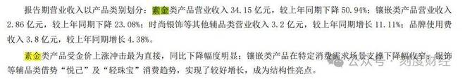 在黄金价格高位震荡、加盟商补货意愿低迷的行业寒冬里,这家以加盟模式为基本盘的珠宝巨头,一边承受着渠道收缩的压力,一边还需要靠着产品结构调整撑起盈利韧性。产品方面,素金类产品营业收入34.15亿元,较上年同期下降50.94%。镶嵌类产品营业收入2.86亿元,较上年同期下降23.08%,时尚银饰等其他辅品类营业收入3.2亿元,较上年同期增长11.11%。品牌使用费收入3.8亿元,较上年同期增长4.38%。