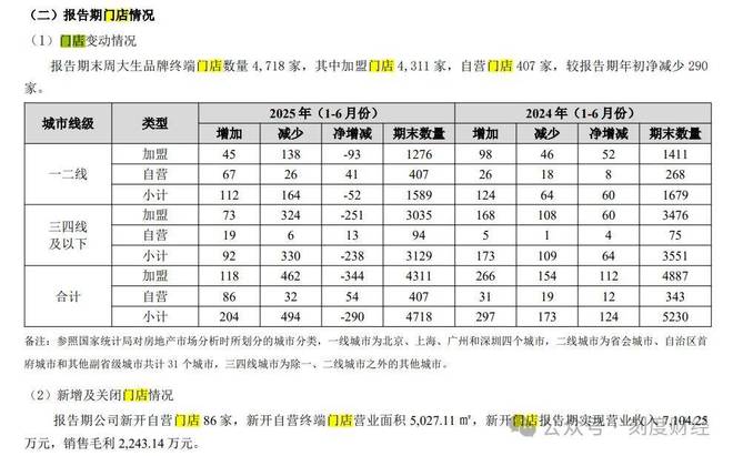 而如今,周大生的渠道版图,正在经历一场收缩与聚焦的调整。截至2025年6月末,终端门店总数4718家,较年初净减290家,其中加盟门店净减344家,三四线及以下城市加盟门店减少251家。